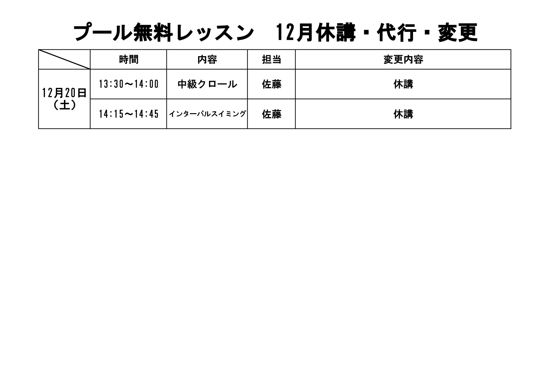 プール無料レッスン12月休講・代行・変更のお知らせ