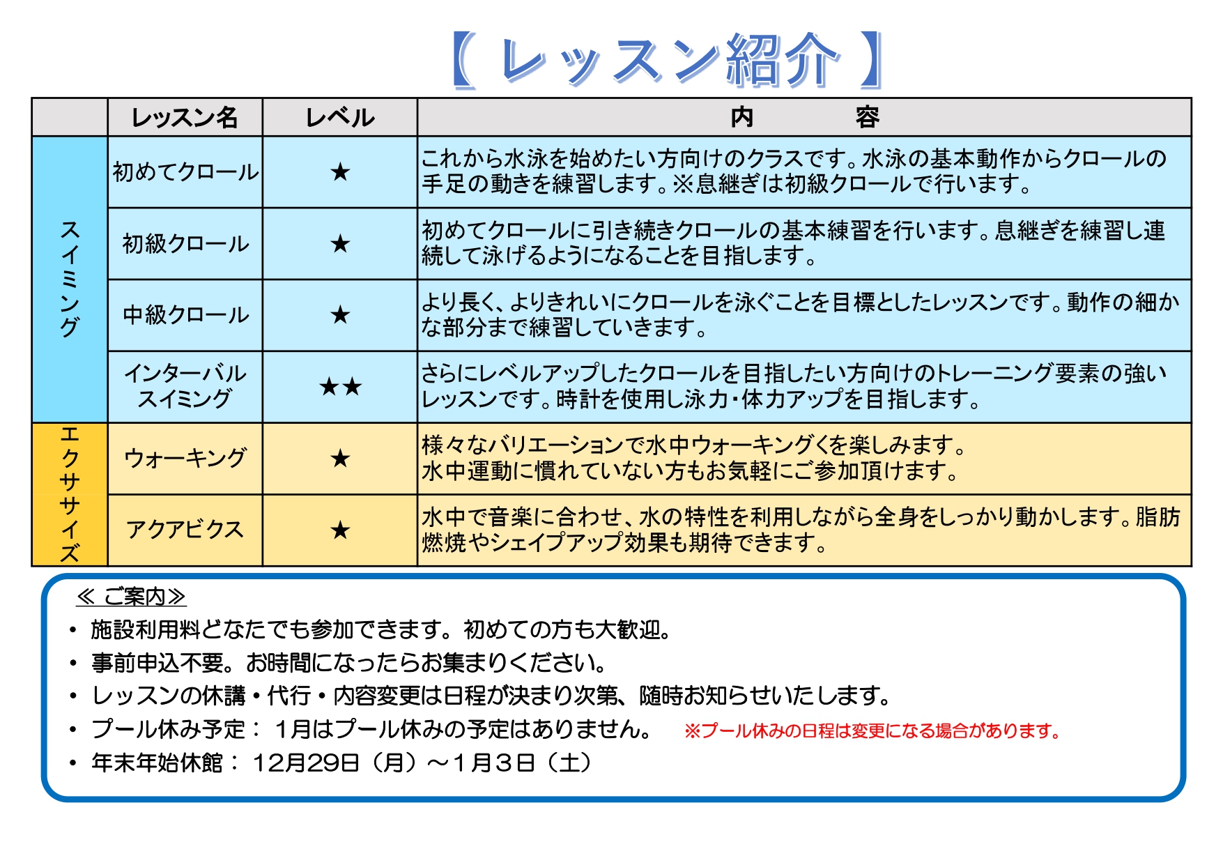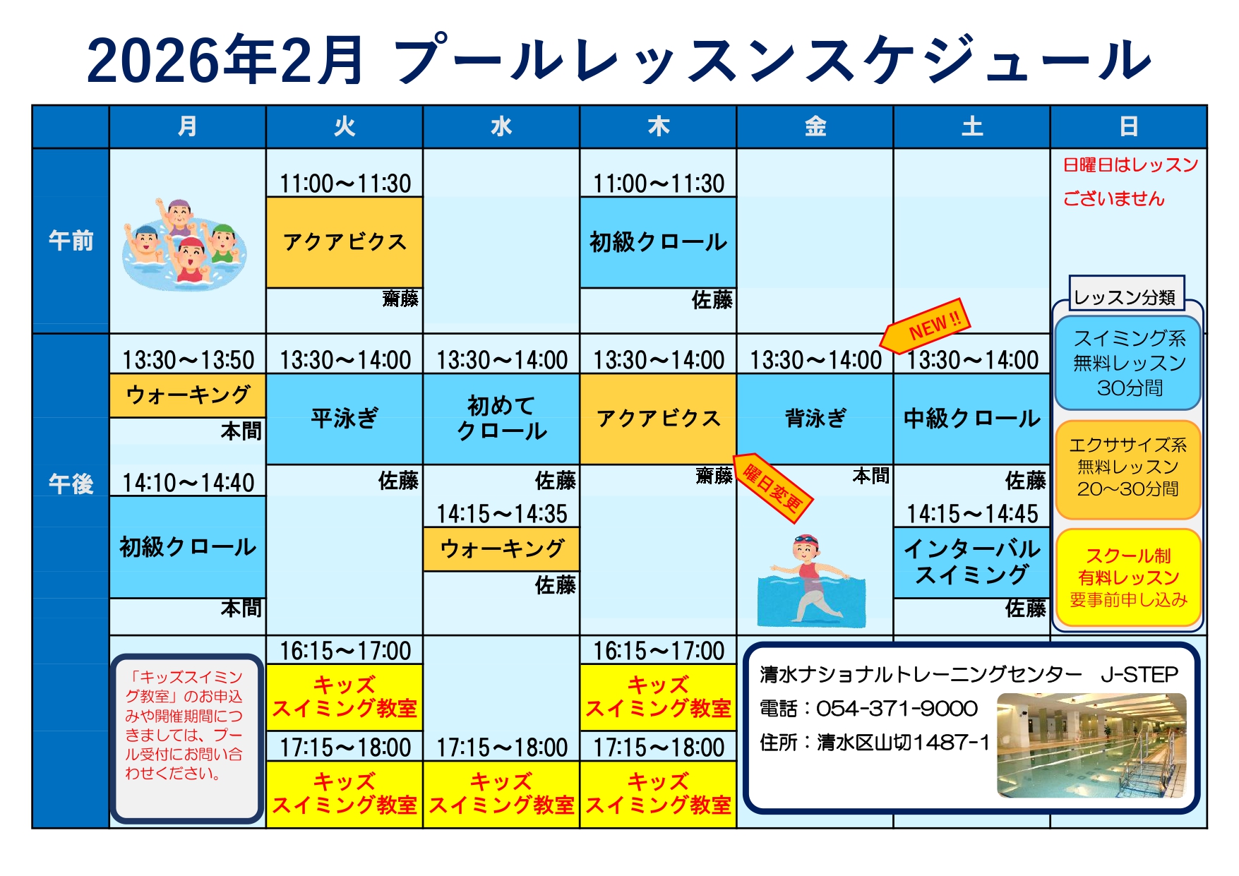 2026年1月14日 / 最終更新日時 : 2026年1月14日 NTC_Shimizu その他 2026年2月プールレッスンスケジュール スケジュールの変更について ①金曜開催の「アクアビクス」は2月より木曜日に変更になります。 ②木曜日に開催していた「背泳ぎ」は金曜日に担当インストラクターを本間に変更し再開します。 ③火曜日の「平泳ぎ」を再開します。 X