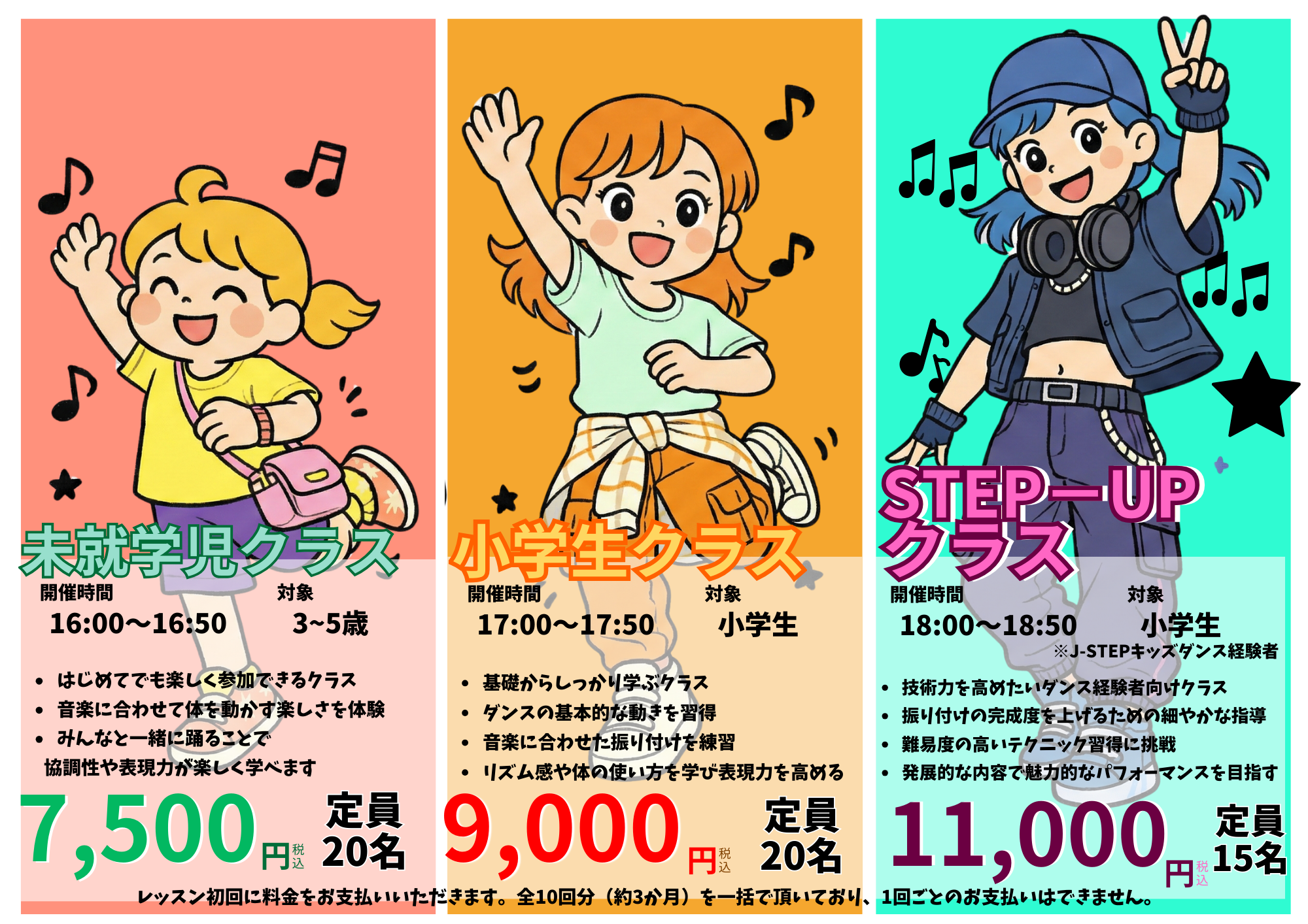 約3か月間・全10回でしっかり成長できるカリキュラム設計。料金も継続しやすい設定で、はじめての習い事にも最適です。
