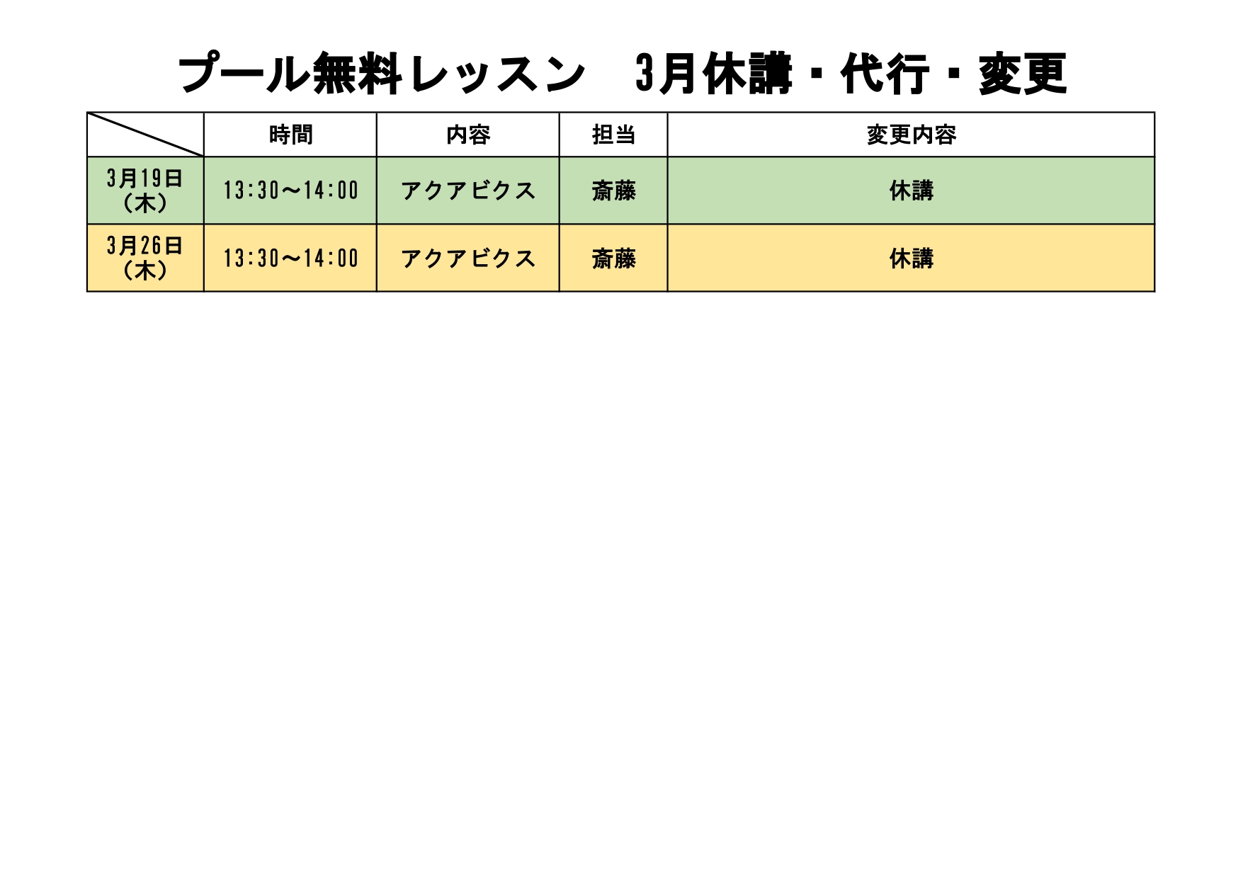 プール無料レッスン2・3月休講・代行・変更のお知らせ