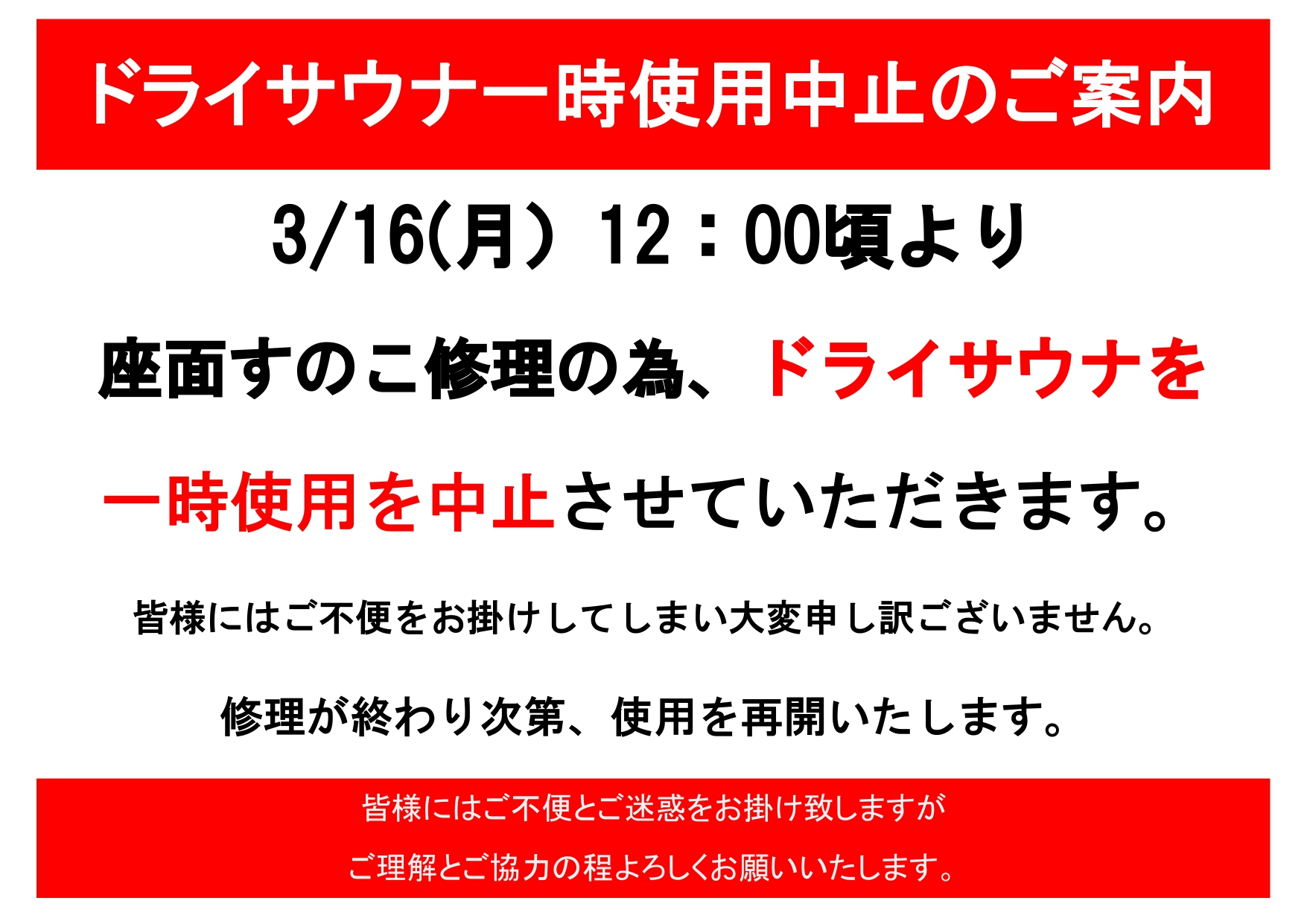 2026年3月12日 / 最終更新日時 : 2026年3月12日 NTC_Shimizu その他 ドライサウナ 修理に伴う一時使用中止のご案内 ドライサウナの座面すのこ修理を行います。 3/16(月)12時頃より修理完了まで一時使用を中止いたします。 皆様にはご不便とご迷惑をおかけしてしまい大変申し訳ございません。 X