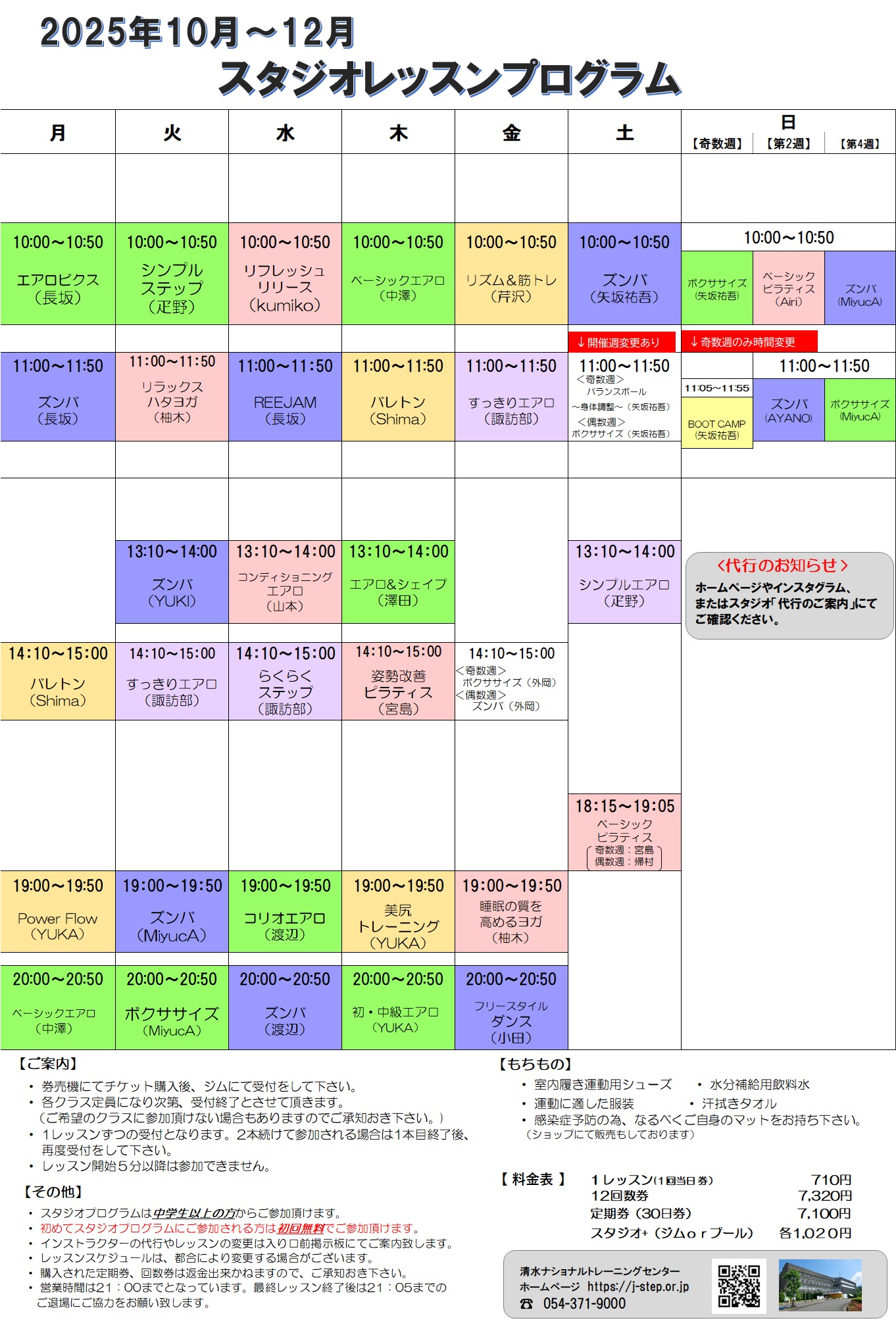 持ち物:・室内用運動シューズ(フィットネスシューズ推奨)・運動に適した服装・ソックス(必ず着用してください)・汗ふきタオル・水分補給用の飲料水・バレエクラス参加の方は、厚手のソックスまたは二重履きでご参加ください。