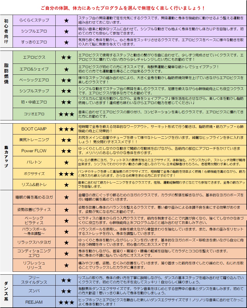 初心者から経験者まで幅広く楽しめるエアロビクス系、美容や整体に効果的なコンディショニング系、さらにはダンス系まで、多彩なプログラムをご用意しています。